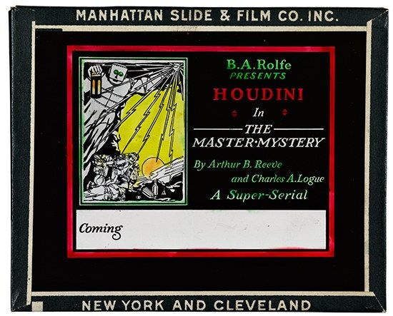 Glass lantern slide advertising Houdini in the film The Master Mystery