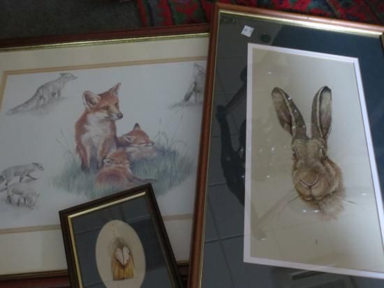 Brass Hare and feather and a study of foxes by Nigel Hemming