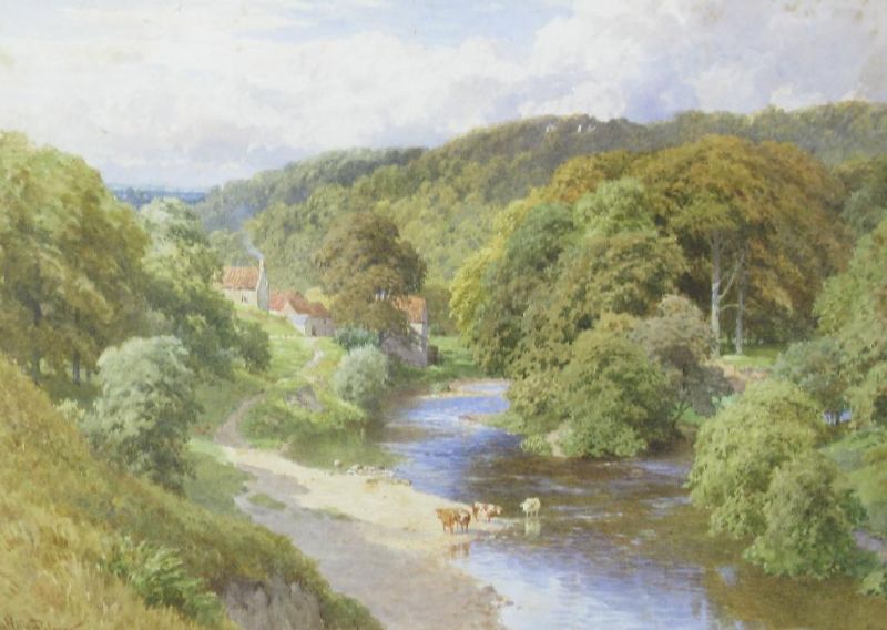 | A tranquil river landscape, with cattle watering at a river said to be near Warkworth, Northumberland | |