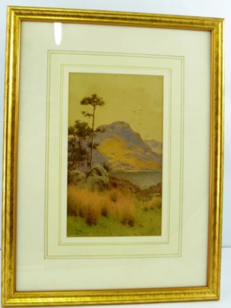 Landscape with tall pine trees, loch and birds soaring over mountainous background