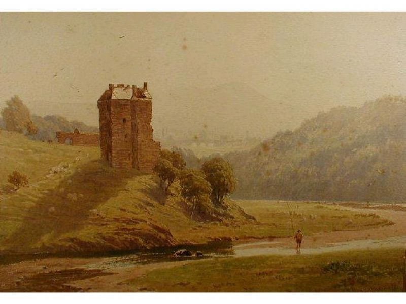 | Neidpath Castle near Peebles, view of the castle and river with fishermen | |