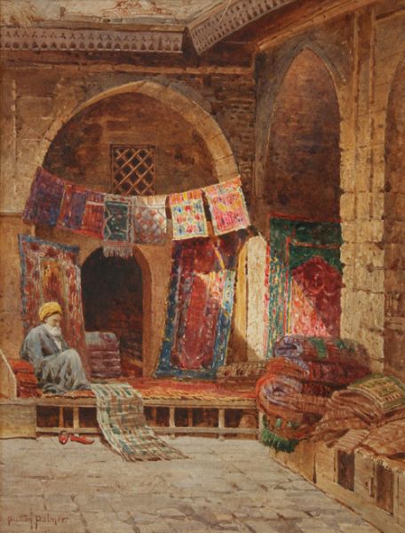 | View of a Market Place, probably Cairo, with a Figure seated on a Raised Platform surrounded by Rugs and Carpets | |