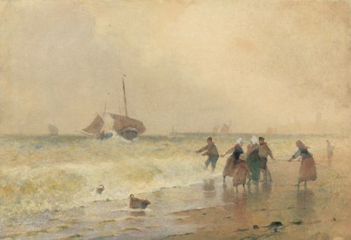 Bretonische Fischer beim Einholen der Boote