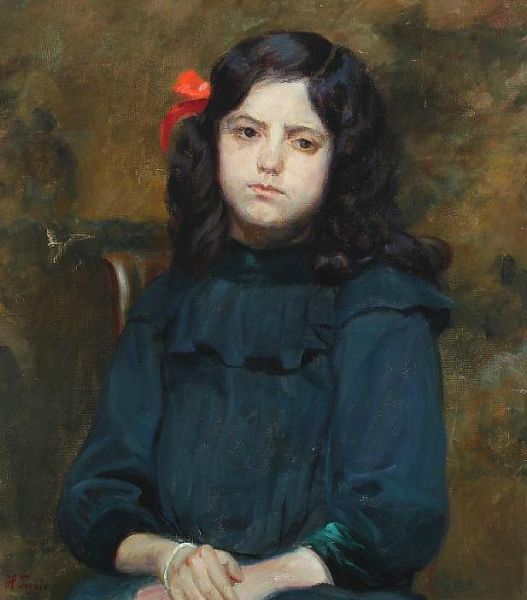 Portrait of a girl with a red bow in her hair.