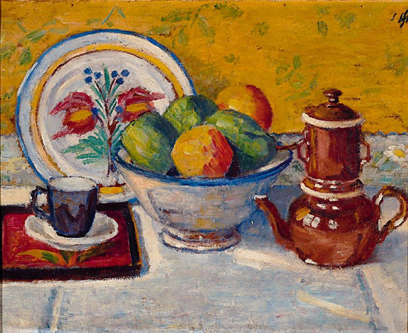 Stilleben mit Kaffeekanne, Tasse, Teller und Obstschale