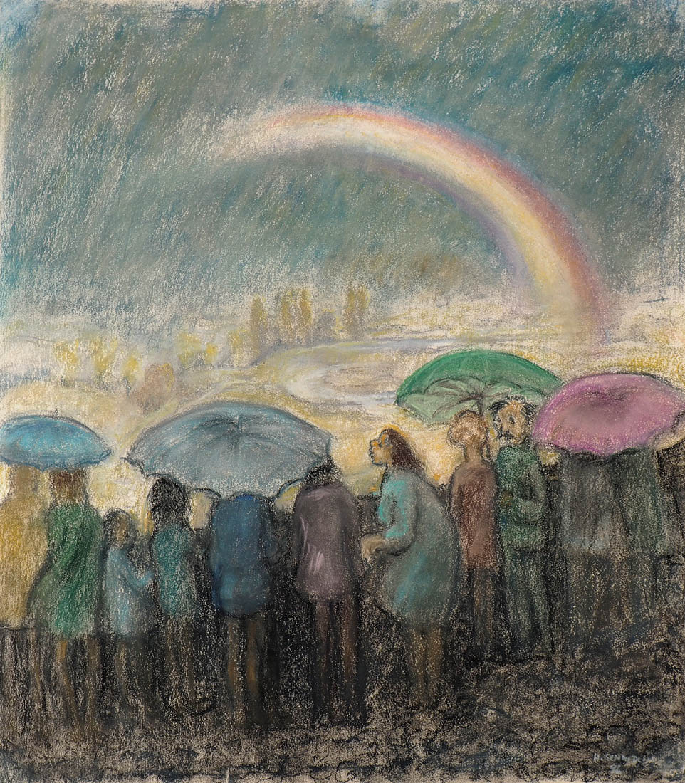 Zuschauer unter Regenschirmen beim Betrachten eines Regenbogens