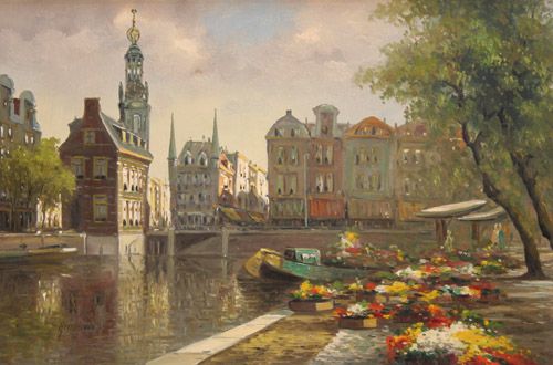 View of Amsterdam with a Flower Market on the Bank of a Canal