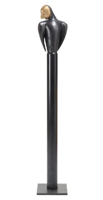 A bronze sculpture of a chimera, raised on a dark patinated metal pillar, slate base