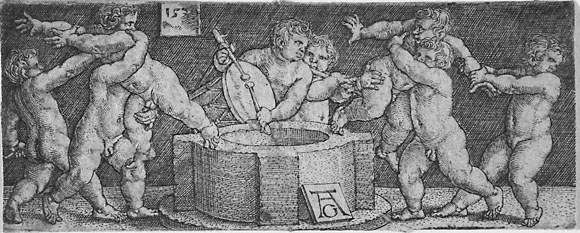 Acht kleine nackte Kinder bei einem Brunnen. - 1539