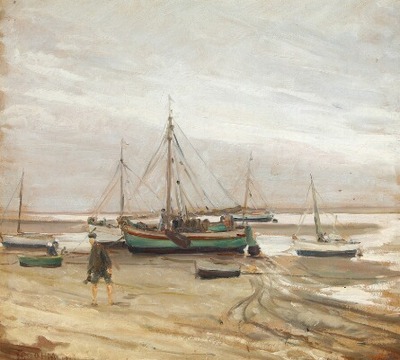 Coastal scene with fishing boats pulled ashore, presumably from Fanoe.