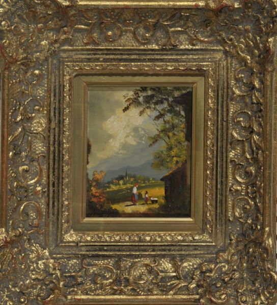 | Mutter und Kind mit Puppenwagen am Waldrand und Blick auf ein Dorf im Voralpenland | |