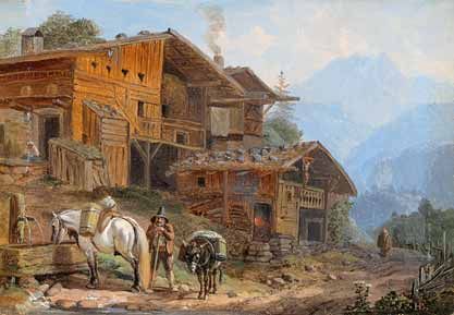 Bauer mit Lasttieren an der Tränke vor einer Almim Hochgebirge
