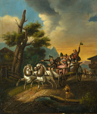 | Von Fest heimkehrende Bauernpaare in Leiterwagen, von zwei dahinstürmenden Schimmeln gezogen | |