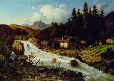 Reissender Gebirgsbach vor einer Hütte in den Alpen