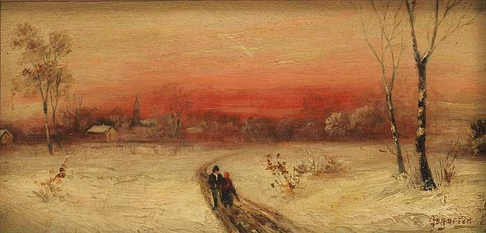 Romantische Winterlandschaft mit Spaziergänger im Abendrot