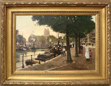 Ansicht eines belebten Kanallaufs in Dordrecht mit Blick auf die Grote Kerk