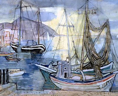 Südländischer Fischerhafen mit ankernden Booten in der Dämmerung.