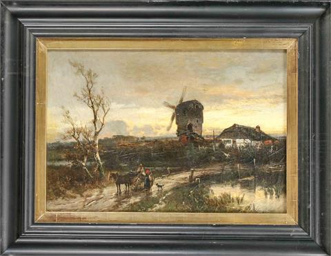 | Bäuerin im Gespräch an einem Wagen in Landschaft mit Mühle und Fachwerkhof im Abendlicht | |