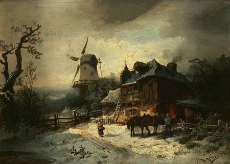 Schneebedeckte Winterlandschaft mit Gehöft, Pferdegespann u. Mühle