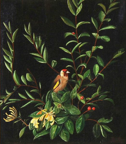 | Robin and ladybird on a branch of blooming honeysuckle | |