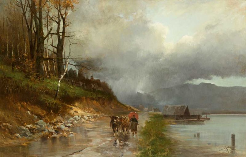 München. Bäuerin mit zwei Ochsen auf dem Weg am Ufer eines Sees