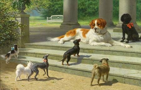 | Bernhardiner und Pudel empfangen auf einer Freitreppe Dackel, Mops, Windspiel, Spitz und King-Charles-Spaniel. Reizendes Tiergen | |