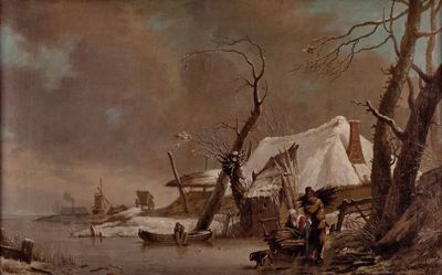 | Große Winterlandschaft mit einem Bauernhaus und einem Bauernpaar beim Holzsammeln | |