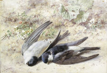 TWO DEAD HOUSE MARTINS ON A GRASSY AND FLOWER-STREWN BANK