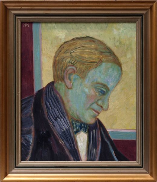 Surreales Portrait eines nachdenklich blickenden älteren Herrn mit Hausjacke und Fliege