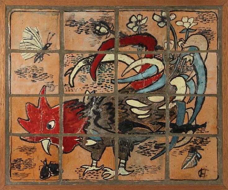 | A stoneware relief with 12 small tiles, decorated with motif in the shape of a cock | |