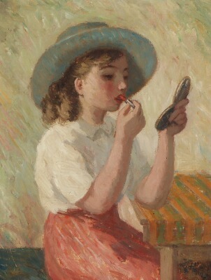 A young woman putting on lipstick