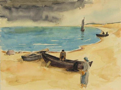 | Fischerboote mit Figurenstaffage am Ufer einer weiten Bucht. Im Hintergrund zieht ein Sturm herauf | |