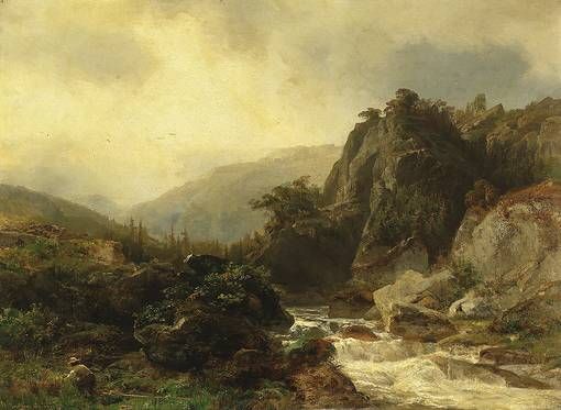 | Ortsbez. Düsseldorf. Gebirgslandschaft mit Wildwasser und Beerenleserin | |