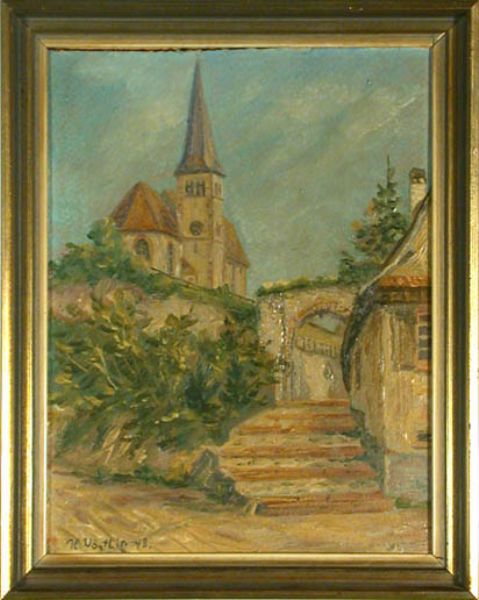 Blick auf die Kirche in Bahlingen am Kaiserstuhl mit Treppenaufgang und Pfarrhaus