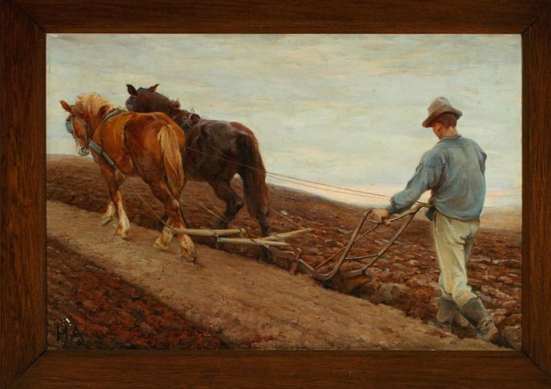 Plowing scene with man and two horses.