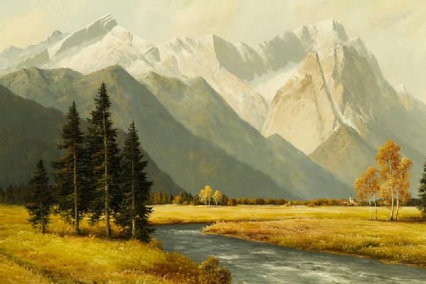 landscape of river and meadows with trees and alpine mountains