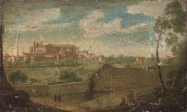 | A wooded landscape with figures by a wall in the foreground and a view of the Basilica of St John Lateran, Rome beyond | |