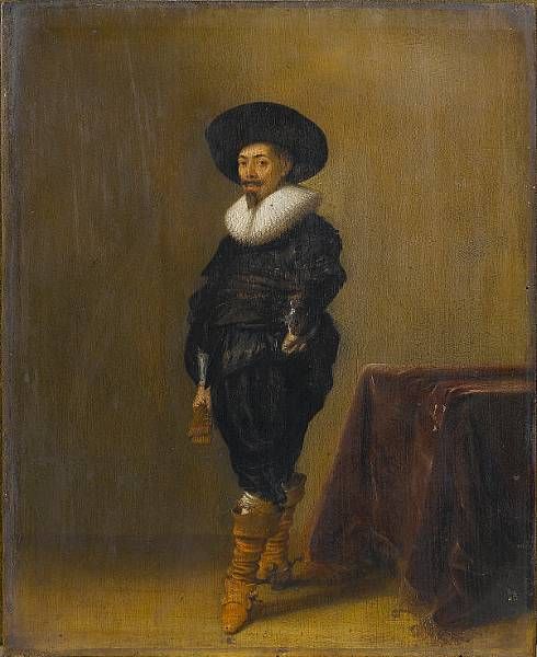 | Portrait of a gentleman, standing small-full-length, in black costume with a white ruff and black hat, holding a pair of gloves, | |
