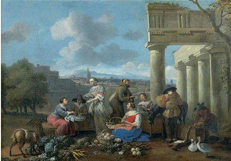 Scène de marché devant des ruines antiques