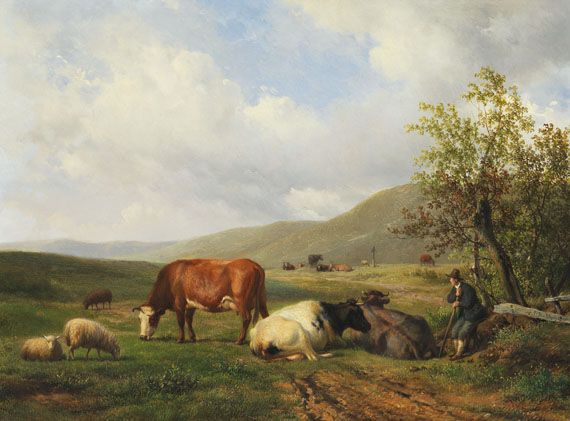 Hirte mit Kühen und Schafen in weiter Landschaft.