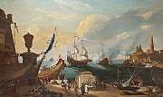 | A Levantine harbour with elegant figures, merchants and stevedores on a quayside with moored shipping beyond | |