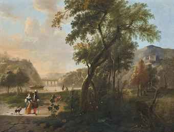 | An mountainous wooded river landscape with elegant company conversing on a track, bathers beyond | |