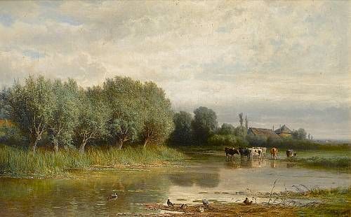River landscape with cattle watering