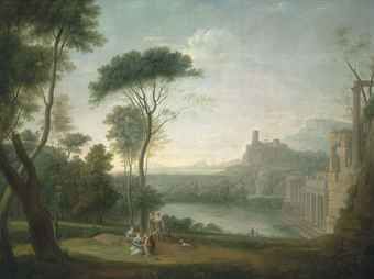 | An extensive Italianate wooded landscape, with classical buildings by a river, the nymph Egeria mourning over Numa in the foregr | |