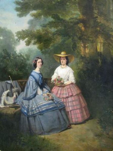 | In sommerlicher Parklandschaft auf einer Parkbank zwei Schwestern, en face dem Betrachter zugewandt, in ihren Händen Blumenbuket | |