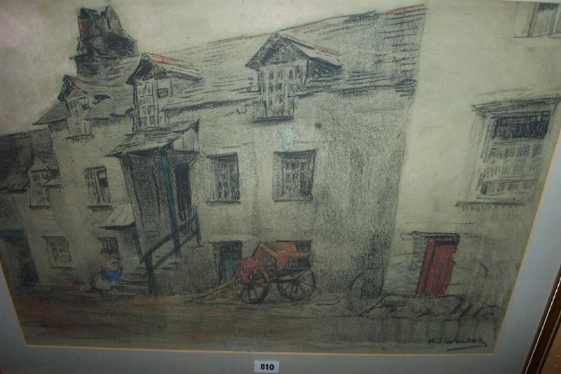 a street scene with cart, woman sewing at a doorway