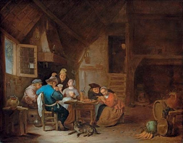 | An interior with peasants seated around a table playing cards | |