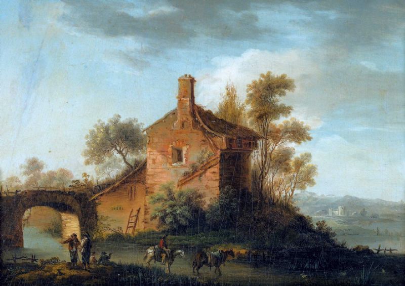 Flusslandschaft mit Bauernhaus und Reisenden.