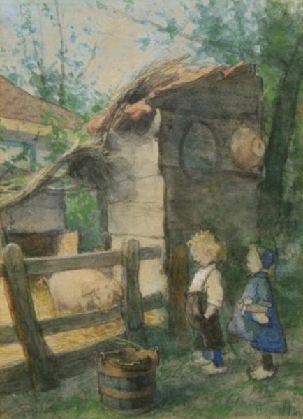 Jongen en meisje bij de varkensstal