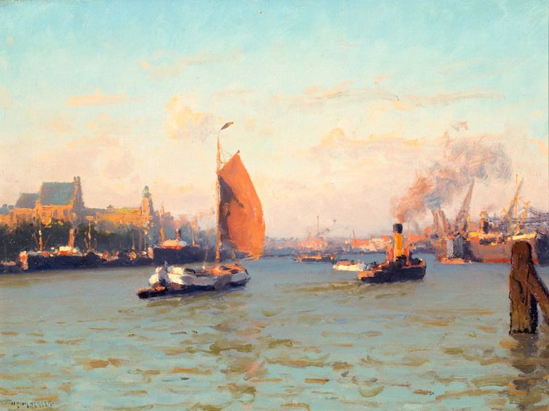 Schepen op de Rotterdamse Maas bij het gebouw van de Holland Americalijn